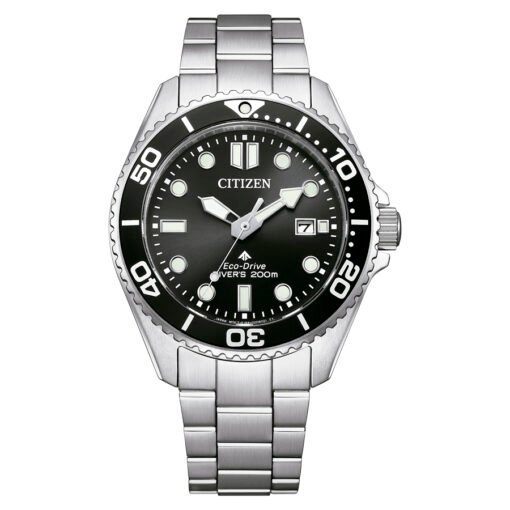 Caja de acero, 11,1mm. de grosor, con fondo y corona cerrados a rosca. Brazalete de acero con doble cierre de seguridad y prolongador incluido para alargar la pulsera. Bisel giratorio unidireccional de color, según modelo. Cristal zafiro plano con tratamiento antirreflejos. Luminous en agujas e índices. Magnetic resistant. Esfera fabricada con plástico reciclado. WR 20 bar.